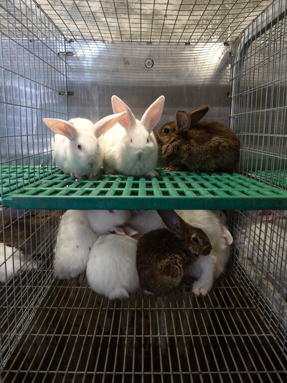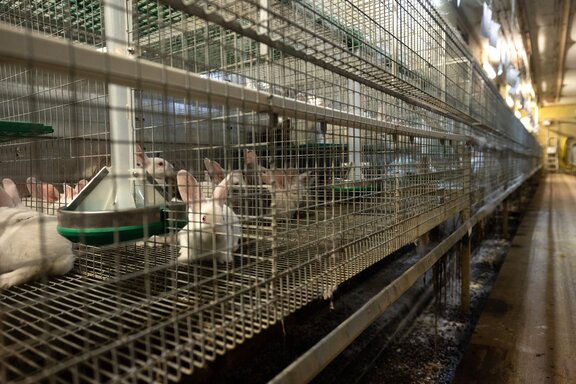 Erst seit August 2014 werden Kaninchen in der Tierschutz-Nutztierhaltungsverordnung überhaupt erwähnt, zuvor galten lediglich die allgemeinen Anforderungen an den Tierschutz. Dementsprechend grausam ist das Bild, das sich in Kaninchenmastanlagen bis heute bietet: Triste, dunkle Hallen ohne ausreichend Tageslicht und Frischluftzufuhr, darin lange Käfigreihen, in denen bis zu mehrere Tausend Tiere ähnlich wie Hühner in den mittlerweile abgeschafften Legebatterien gehalten werden. Die Käfige sind kaum größer als ein Zeichenblock, Rückzugsmöglichkeiten gibt es nicht. Die Drahtgitterböden schneiden tief in die empfindlichen Pfoten der Tiere ein, und unter den Käfigen türmen sich Kot und Futterreste. In der Luft liegt der beißende Gestank von Ammoniak, und viele Tiere leiden deswegen an Entzündungen der Augen und Atemwegserkrankungen. Die Kaninchen leiden außerdem extrem unter dem Bewegungsmangel und dem nicht artgemäßen Kraftfutter. In kürzester Zeit werden sie auf ein Schlachtgewicht von drei bis vier Kilogramm gemästet und nach wenigen Monaten geschlachtet.