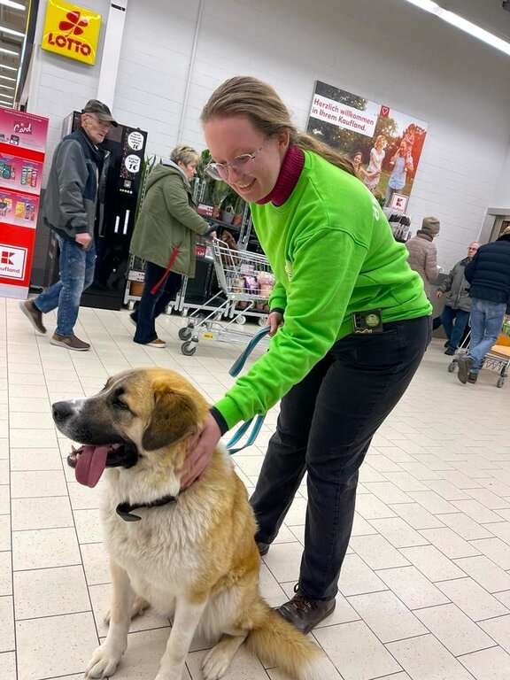 Gegen Mittag marschierte plötzlich ein imposanter Herdenschutzhund direkt auf den aktion tier Stand zu und blieb dort ruhig stehen. Die aktion tier Mitarbeiterinnen Karolina Kucharska und die neue Kollegin Lisa Runge waren gleichermaßen überrascht und gerührt von dem unerwarteten Besuch. Sofort ergriffen sie die Initiative und riefen die Polizei sowie das Ordnungsamt an. Zu ihrer Erleichterung hatte das Ordnungsamt sogar ein Chip-Auslesegerät dabei. In einem ersten Rückschlag stellte sich heraus, dass die Hündin nicht gechippt war. Jedoch trug sie einen GPS-Tracker, der prompt zu blinken begann. Die Polizei entschied sich dafür, die Hündin vorerst in ihre Obhut zu nehmen.