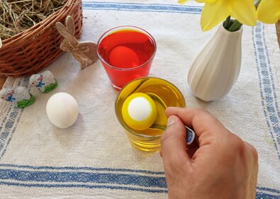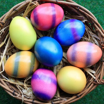 Wer keine Eier mag oder aus Tierschutzgründen darauf verzichten möchte, kann beispielsweise zum Backen Bananen, das Abtropfwasser von Kichererbsen oder vegane Ei-Ersatzprodukte, die meist aus Stärke und Pflanzenproteinen bestehen, verwenden. Als Ostersymbol im traditionellen Nest eignen sich Schokoladen- oder Gelee-Eier, die es auch komplett „ohne Tier“ gibt. Wer sich mehr Mühe machen möchte, kann auch vegane Kekseier backen oder Eier aus zerkleinerten Nüssen und Datteln formen, und diese dann für den bunten Touch in Zimt, Kurkuma oder Rote Beete Pulver wälzen. Für die Osterdeko können Eier aus Keramik, Pappmaché vielleicht sogar selbst gebastelt oder wenigstens angemalt werden.