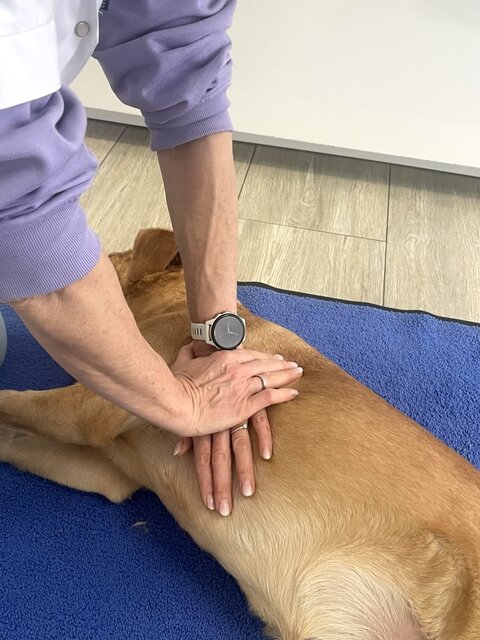 Sollten im schlimmsten Fall weder Puls noch Atmung feststellbar sein, muss sich der Ersthelfer ein Herz fassen und versuchen, das Tier wiederzubeleben. Zu verlieren haben wir in dieser Situation nichts. Also mutig voran! Zunächst bringt man das Tier in Seitenlage, vorzugsweise auf seine rechte Körperseite. Das Herz findet man an der Stelle, an der der Ellenbogen des angewinkelten Vorderlaufs den Brustkorb berührt. Nicht wundern, der Ellenbogen ist beim Tier sehr weit oben, in der Nähe des Rumpfes. Hat man die Herzhöhe lokalisiert, werden bei großen Hunden beide Hände übereinandergelegt, bei kleinen Hunden genügt eine Hand, bei Katzen reicht auch nur der Druck mit Daumen und Fingern einer Hand.