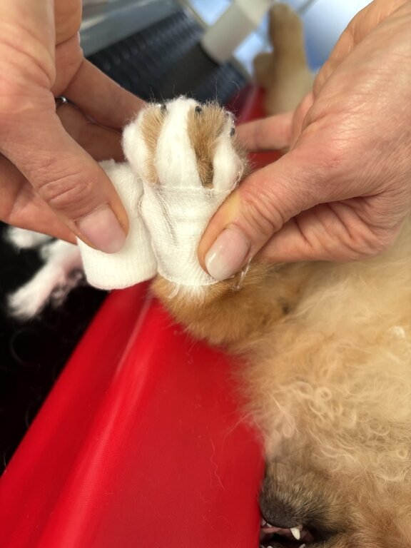 Starke Blutungen müssen sofort gestoppt werden. Genau wie beim Menschen ist ein Druckverband hier das Mittel der Wahl. Im ersten Moment darf auch ein Gürtel oder eine Hundeleine hierfür benutzt werden. Für Verbände, die über mehrere Tage angelegt werden, sind Tupfer, Mullbinden, Polsterwatte sowie elastische Binden geeignet. Ein korrekt sitzender Verband darf nicht zu locker und nicht zu fest sitzen. Er sollte immer das Gelenk miteinschließen, das über der Verletzung sitzt, damit er nicht abrutscht. Bei Pfotenverletzungen ist es extrem wichtig, die Zehenzwischenräume gut auszupolstern, um Druckstellen zu vermeiden. Hierbei darf die Daumen- bzw. Wolfskralle nicht vergessen werden. Unterlässt man das Abpolstern, kommt es zu Nekrosen im Zwischenzehenbereich, die extrem schlecht zur Abheilung zu bringen sind. Unter dem Strich ist zu sagen: Besser kein Verband als ein schlecht angelegter. Im Prinzip gehört das Anlegen eines Verbandes in die Hände von Fachpersonal.