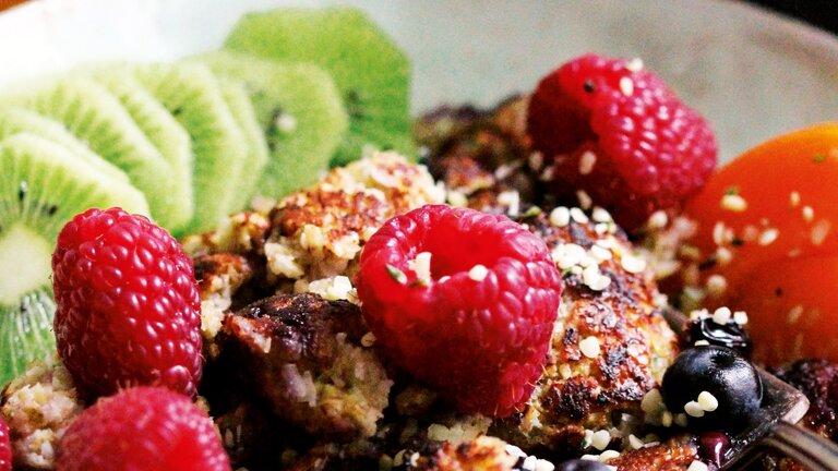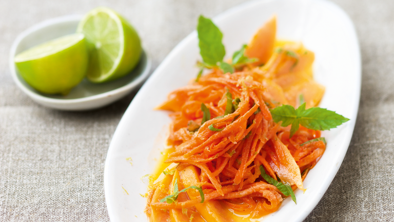 Ingwer-Lauch-Blinis mit gebackenen Möhrenspießchen