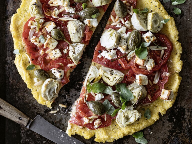 Goldgelbe Polentapizza mit Tomate und Artischocken