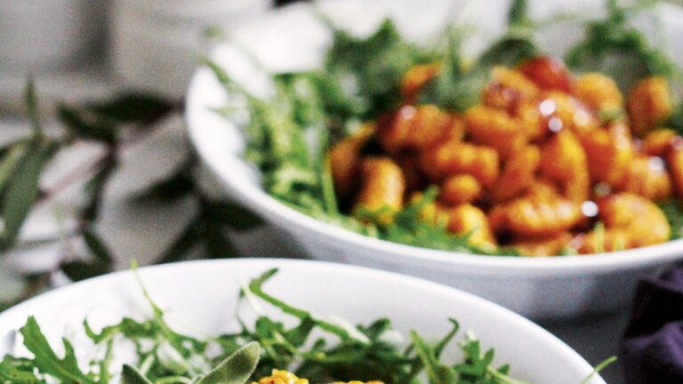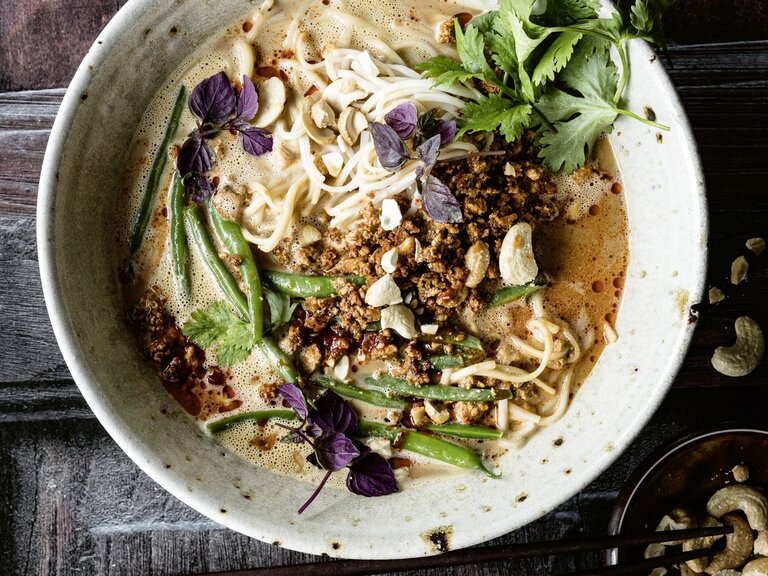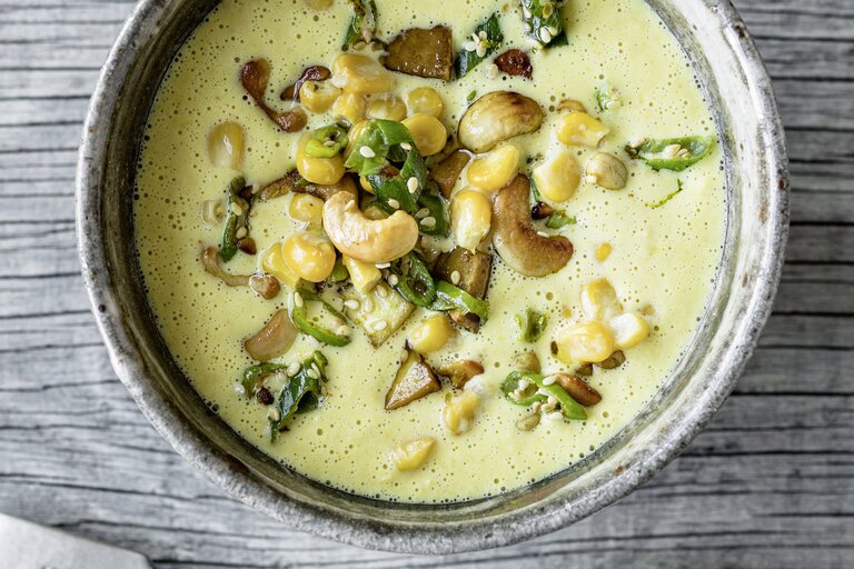 Maiscremesuppe mit Frühlingszwiebel und Tofu-Cashew-Topping