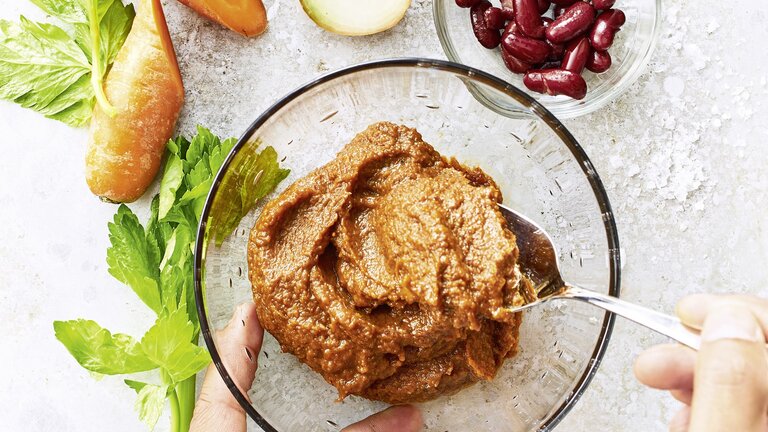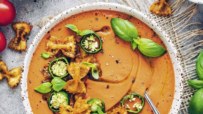 Paprika-Bohnen- Gazpacho mit Birnen-PaprikaSalsa