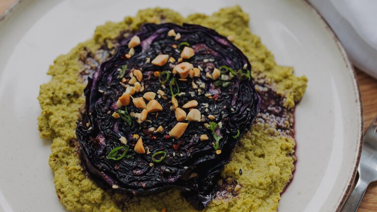 Geröstete Rotkohlsteaks mit Soja-Chili-Glasur auf Erbsenpüree