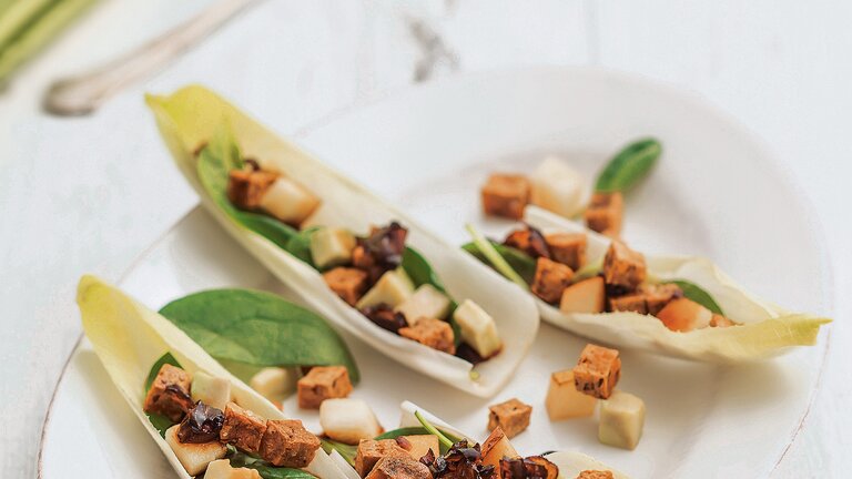 Chicoréeschiffchen mit geräucherten Croûtons und Balsamicoreduktion