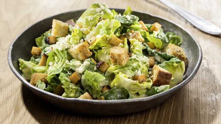 Caesar Salad mit Cashew-Dressing und Oregano Croûtons
