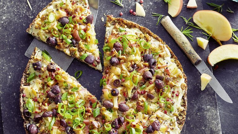 Apfel-Walnuss-Pizza mit Oliven auf Sellerieboden
