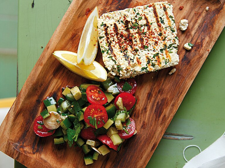 Kräuter- Grillkäse mit Gurken-Tomaten-Salat