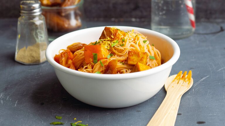 Hokkaidokürbis mit Datteln und Reisnudeln