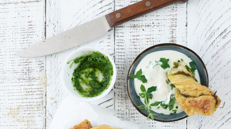 Blumenkohlsuppe mit Tahin und Granatapfel Pesto