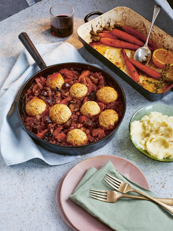 - Die Knödel auf den Eintopf setzen und einen Topfdeckel auflegen. Im Ofen 20 Minuten backen, dann den Deckel abnehmen und noch weitere 10-15 Minuten backen, bis die Knödel goldgelb und fluffig sind.
