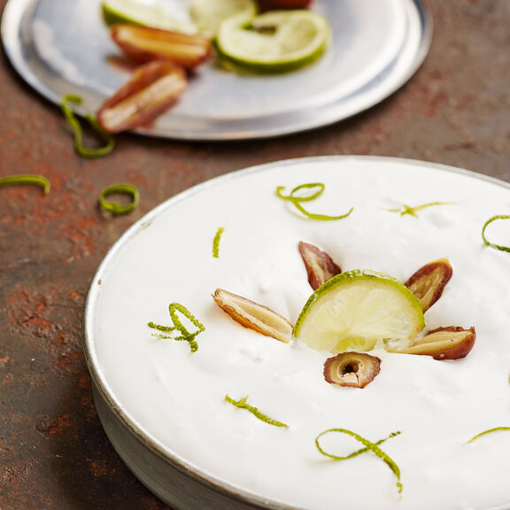 Mit einem scharfen Hobel feine Zesten von den Limetten ziehen und die Limetten anschließend auspressen. Den Saft unter die geschlagene Sahne heben und diese auf dem Kokos-Dattel-Boden verteilen.