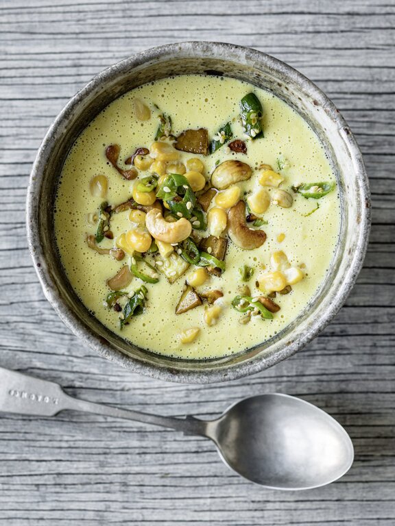 Maiscremesuppe mit Frühlingszwiebel und Tofu-Cashew-Topping