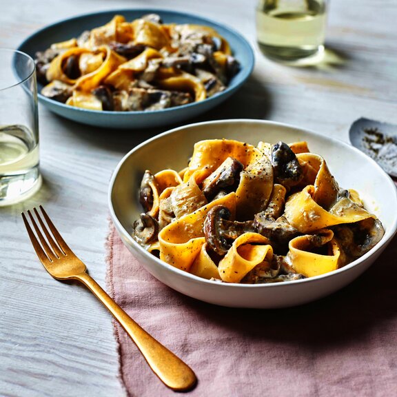 Pappardelle mit 1 Pilzen in cremiger Weißweinsauce