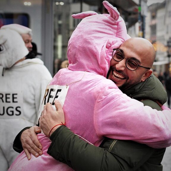 Die verkleideten Aktivisten umarmen Passanten und werben mit dem Motto „Meine Freunde ess ́ ich nicht“. Damit möchten sie darauf hinweisen, dass auch sogenannte Nutztiere ein Recht auf Liebe und Zuneigung haben und diese genauso brauchen wie Katzen oder Hunde. Im vergangenen Jahr fand die Aktion bereits in Hannover, Hamburg, Berlin und Bonn statt, wo die Tierschützer mit offenen Armen begrüßt wurden. Weitere Aktionen für dieses Jahr sind bereits geplant.