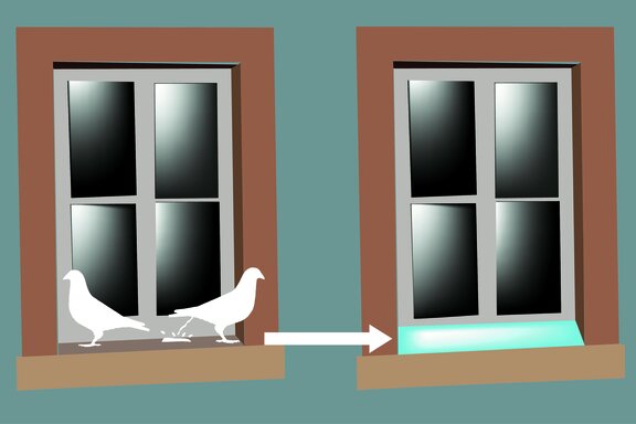Tauben können nur auf geraden Flächen sitzen. Rostfreie Bleche im 45-Grad-Winkel verhindern, dass sich die Vögel auf Fensterbrettern, Simsen und Vorsprüngen niederlassen, diese mit ihrem Kot verschmutzen und Nester darauf bauen. Am besten berücksichtigt man diese tierfreundliche, unschädliche und unauffällige Maßnahme bereits bei der Planung von Gebäuden und Bauwerken.