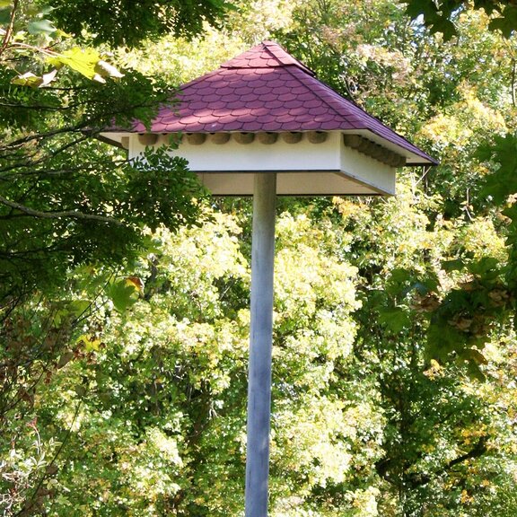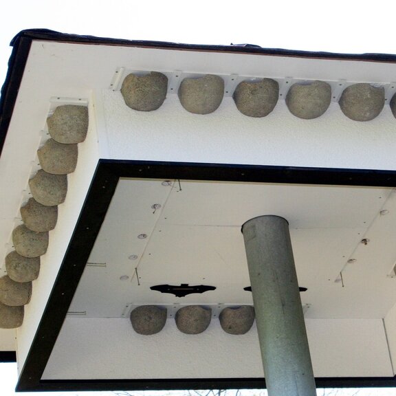 In Bereichen mit großen Schwalben- Populationen, aber wenigen Nistmöglichkeiten ist das Aufstellen eines Schwalbenhauses sinnvoll. Dieses von der VWI verwendete Modell besitzt vorgefertigte Nester für Mehlschwalben und ist im Innern als Fledermausquartier ausgebaut.