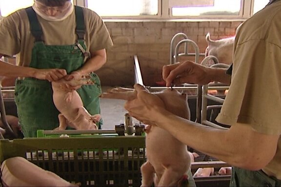 Bis zum 7. Lebenstag ist die betäubungslose Kastration von Mastferkeln auch weiterhin erlaubt. Um das mögliche Entstehen von Ebergeruch beim Braten des Fleisches zu verhindern, wird mit einem Skalpell der Hodensack der Tiere geöffnet, anschließend werden die Samenstränge durchtrennt oder die Hoden einfach ausgerissen. Der Schmerz muss unglaublich sein, auch wenn Lobbyvertreter gerne das Gegenteil behaupten. Aus diesem Grund sollte das grausame Vorgehen endgültig verboten werden. Doch die ursprünglich vorgesehene Zeit zur Entwicklung von Alternativen wurde nicht genutzt. Dabei gibt es diese bereits: Mit einer Impfung kann die Bildung von Geschlechtshormonen unterdrückt werden (sogenannte Immunokastration). Auch eine Narkose wäre möglich.