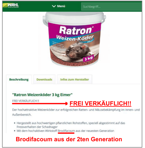 Aber alle Vorschriften und Bestimmungen sind sinnlos, wenn jedermann sich jede Substanz im Internet beschaffen kann. Wir haben ein wenig recherchiert und sind sehr schnell auf ein Angebot gestoßen: Giftweizen mit dem Wirkstoff Brodifacoum, ausdrücklich frei verkäuflich! Brodifacoum ist das potenteste, verfügbare Rattengift überhaupt. Als Antikoagulanz der 2ten Generation darf Brodifacoum zu Recht nur von berufsmäßigen Verwendern (z.B. professionelle Schädlingsbekämpfer) benutzt werden und darf nur in verschließbaren, stabilen Köderboxen ausgelegt werden. Und jetzt dieses Angebot im Internet. Mit einem Klick kann das hochgefährliche Produkt entgegen der gesetzlichen Bestimmungen bestellt und natürlich auch verwendet werden. Zum Vergiften von Ratten und Mäusen oder von Hunden und Tauben. Wer kann das kontrollieren?
