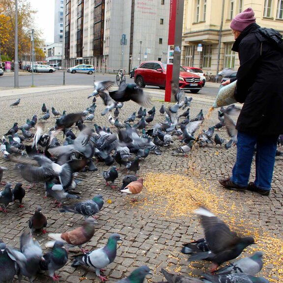 In Berlin ist das Füttern von Tauben übrigens nicht verboten. Allerdings müssen Fütterer darauf achten, nur so viele Körner auszustreuen, wie von den Tieren gefressen werden können. Bleibt Futter liegen, ist das eine Verunreinigung öffentlichen Straßenlandes. Und das wiederum ist eine Ordnungswidrigkeit, die mit einem Bußgeld belegt werden kann.