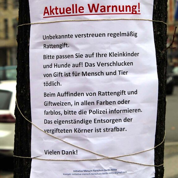 Nachdem die Taubenfütterer selbst recherchiert haben und den Arbeitsplatz des mutmaßlichen Giftlegers in Erfahrung bringen konnten, hoffen jetzt alle, dass die Polizei seine Identität herausfinden und ihn zumindest vernehmen kann. Gibt es Beweise wie etwa Zeugen, die den Mann beim Giftauslegen ertappt haben, müsste er sich wegen diverser Rechtsverstöße verantworten: zum Beispiel gegen das Berliner Straßengesetz (Verunreinigung öffentlichen Straßenlandes), gegen das Chemikaliengesetz und die Gefahrstoffverordnung (Missachtung der Anwendungsbestimmungen von Gift) sowie gegen das Tierschutzgesetz. Dort steht im § 17, dass derjenige mit einer Freiheitsstrafe bis zu drei Jahren oder mit Geldstrafe von bis zu 25.000 Euro bestraft wird, der ein Wirbeltier ohne vernünftigen Grund tötet oder diesem länger anhaltende oder sich wiederholende erhebliche Schmerzen oder Leiden zufügt. Wenn also nachweislich ein Hund, eine Katze oder ein anderes Tier durch das Gift gestorben ist, kann es eine saftige Strafe hageln. Stadttauben werden teilweise zu den Schädlingen gerechnet und ihre Vernichtung behördlich angeordnet. Aber auch in diesem Fall wäre es strafbar, eigenmächtig eine Vergiftung der Vögel mit Rodentiziden vorzunehmen