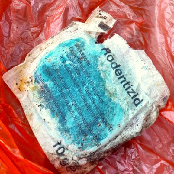 Als sich die Frauen nicht einschüchtern und vom Füttern abhalten ließen, folgte Stufe zwei des Anti-Tauben-Terrors in Form einer bratfertigen Zuchttaube, die in einer von den Tierfreunden aufgestellten Wassertränken lag. Deutlicher konnte die Warnung nicht sein, die dann schnell Realität wurde. Nur einige Tage später war das Wasser in den Näpfen giftgrün. Die Frauen schütteten es weg und ahnten noch nicht, dass hier systematisch Tauben vergiftet werden sollten. Bis sie kurz darauf halbaufgelöste Pads mit blauer Paste in den Wasserschalen vorfanden. Die Aufschrift „Rodentizid“ schaffte Klarheit: Es handelte sich um Gift, das zur Bekämpfung von Ratten und Mäusen gedacht ist (lesen Sie mehr zu diesem Giftstoff im Folgebericht auf den Seiten 3642). Coumatetralyl, der Wirkstoff in der Paste, gehört zu den sogenannten Antikoagulantien. Diese vermindern die Blutgerinnung, so dass Nager 5-10 Tage nach der Aufnahme qualvoll an inneren Blutungen sterben. Tauben auch, denn das Gift wirkt bei allen Tieren und auch bei Menschen. Das verseuchte Wasser stellte also eine Gefahr für alle Wild- und Haustiere dar, die an den Schalen ihren Durst stillen. Gemäß Herstellerempfehlung soll das blaue Nagergift nicht umsonst nur in abschließbaren Köderboxen ausgelegt werden.