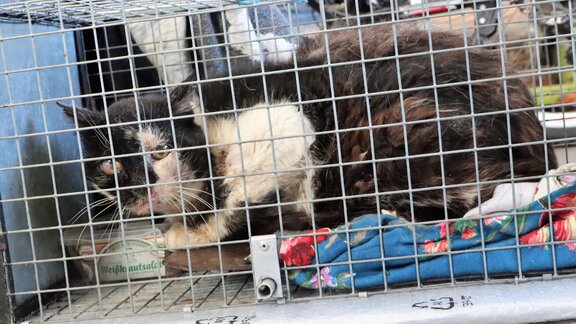 Zurück an ihrem Wohnort gingen Frau Khella die Katzen nicht aus dem Kopf, und so wandte sie sich schließlich an ihren Verein. Wir planten gemeinsam die Kastrationsaktion und trafen uns ein paar Wochen später im Schwarzwald. Frau Khella hatte die Katzen bereits seit mehreren Tagen in den Lebendfallen gefüttert, um sie an diese Käfige zu gewöhnen. Da sich in den Köpfchen schnell die Formel „Falle = Futter = super!“ eingebrannt hatte, gingen die Vierbeiner dann auch ohne Zögern in die Fallen, als diese scharf gestellt waren. Über mehrere Tage hinweg wurden so alle Katzen eingefangen und in einem Zimmer in der Spedition einsperrt. Dort konnten die Tiere mit genug Platz, mehreren Katzenklos und Futter auf den Kastrationstag warten.