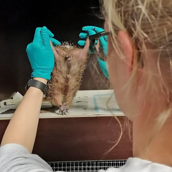 Ein weiterer Fall ereignete sich ebenfalls in der privaten Pflege eines Igels. Es fiel auf, dass die Hinterfüße des Igels stark geschwollen waren. In der Untersuchung in Narkose konnten wir menschliche Haare entfernen, welche sich um die Beine und Füße des Igels gewickelt hatten. Das Tier hatte nachts Freilauf in der Wohnung. Was gut gemeint war, hatte schwerwiegende Folgen. Zum Glück war noch die Blut- und Nervenversorgung gegeben und die Füße sind wieder abgeschwollen. Noch befindet sich das Tier auf Station und kann dann hoffentlich bald wieder ausgewildert werden.