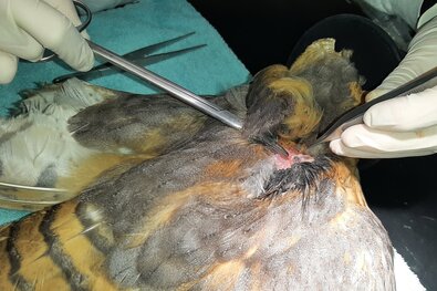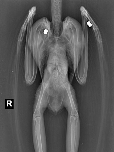 Im Rahmen der Eingangsuntersuchung in der aktion tier Wildtierstation wurde die Eule durch Tierärztin Karolin Schütte geröntgt und dabei festgestellt, dass zwei Luftgewehrprojektile – sogenannte „Diabolos“ – im Körper der Schleiereule steckten. In einer anschließenden Operation wurden die Projektile entfernt. Unter anderem wurden Knochen der linken Handschwinge verletzt und das rechte Schulterblatt durchschlagen. Bis Anfang Mai blieb die Schleiereule bei uns in der Station und konnte dann vollständig genesen wieder ausgewildert werden.