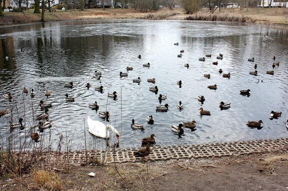 Es ist zwar unwahrscheinlich, dass ein gesunder Wasservogel im Eis festfriert, aber das ohnehin schmale Nahrungsangebot in dem völlig verschlammten und mit Müll verunreinigten Teich verringert sich bei geschlossener Eisdecke natürlich weiter. Höckerschwäne sind Vegetarier. An Land fressen sie Gras oder Getreidepflanzen wie Raps. Sie verbringen jedoch die meiste Zeit im Wasser und suchen sich auch hier ihre natürliche Nahrung,die vor allem aus Uferund Wasserpflanzen sowie Algen besteht. Diese Möglichkeit würde mit dem vollständigen Zufrieren des Teiches wegfallen, so dass unser Schwan immer schwächer werden würde. Auch könnte er auf dem Eis wahrscheinlich nicht mehr starten, um sich aus der misslichen Lage selbst zu befreien.