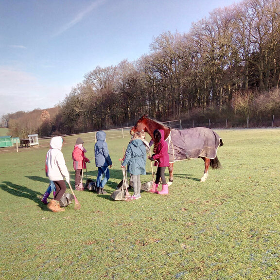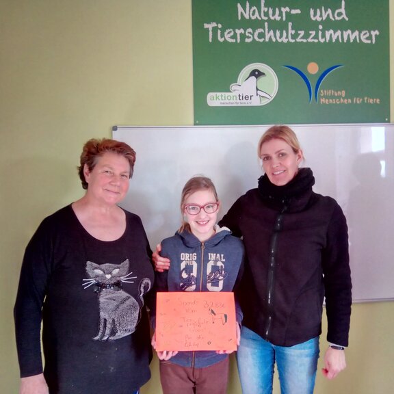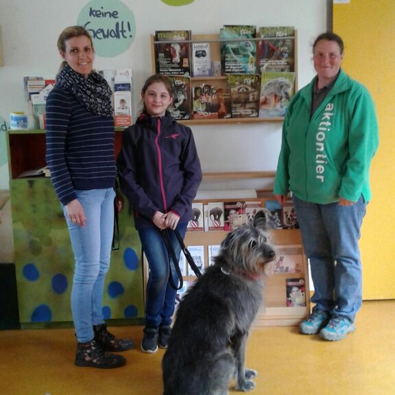 Auch im Hinblick auf die Osterzeit gab Christine Geburtig von aktion tier den jungen Tierfreunden wichtige Hinweise. Industriell gekochte und bunt gefärbte Eier stammen aus Kostengründen oft von Hennen aus der Käfig-Massentierhaltung oder Bodenhaltung. Da diese Eier im Gegensatz zum ungefärbten Schalenei nicht mit dem Eierstempel gekennzeichnet werden müssen, bleibt ihre Herkunft dem Verbraucher nicht selten verborgen. Daher rät aktion tier grundsätzlich vom Kauf der gefärbten bunten Eier ab. Um das Lernerlebnis abzurunden, bekamen die Schüler und Schülerinnen der Tierschutz AG die Gelegenheit, den aktion tier Lottihof und die ehemaligen Legehennen zu besuchen. Im Gepäck hatten die engagierten jungen Tierschützer eine Spende von 32,83 EUR, die sie durch den Verkauf selbstgemachter Leckereien gesammelt hatten. Die Schüler und Schülerinnen halfen tatkräftig auf dem Hof mit, lernten etwas über die Bedürfnisse von Nutz- und Haustieren und machten anschließend einen Spaziergang mit den Eseln des Gnadenhofes.