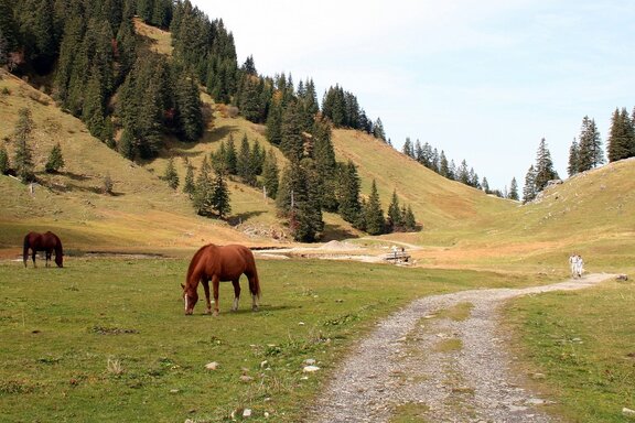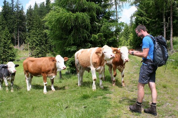 Wanderwege in den Bergen führen oft über Weideflächen mit Tieren, und das Durchqueren einer Alm mit Rindern, Pferden oder Schafen empfinden viele Menschen als interessantes Erlebnis. Allerdings sind wir Zäune gewohnt, die uns von den Weidetieren trennen und auch vor ihnen schützen. Völlig ohne Absperrung größeren, freilaufenden Nutztieren zu begegnen, kann daher auch beängstigend sein. Dass Wanderer von Rindern oder Pferden angegriffen werden, kommt immer mal wieder vor. Verletzungen oder gar Todesfälle sind jedoch die große Ausnahme. Man sollte davon ausgehen, dass Weidetiere grundsätzlich friedfertig und primär an den schmackhaften Bergkräutern interessiert sind. Kommt es zu einem Konflikt, sind in den allermeisten Fällen die Ausflügler diejenigen, die durch falsches Verhalten einen Unfall oder Angriff provoziert haben.