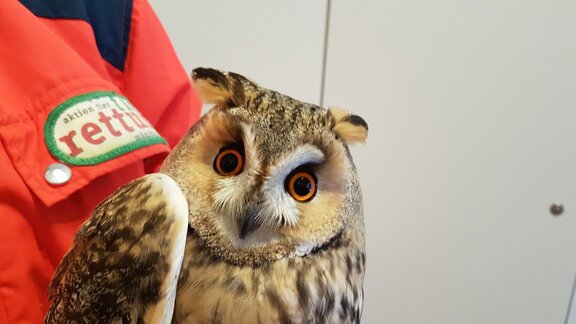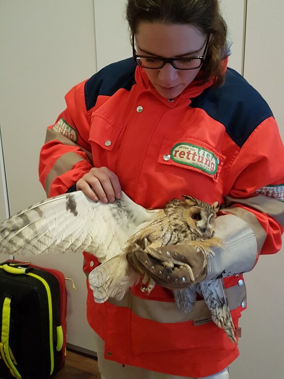 Die Finder hatten es zwar geschafft, das Tier zu befreien, konnten es jedoch nicht direkt in die Vogelklinik nach Oberschleißheim bringen. Da sie aber die Möglichkeit hatten in unsere Dienststelle zu kommen, übernahmen wir die Erstuntersuchung und Behandlung des Raubvogels. Bei der beeindruckenden Patientin handelte es sich um eine Waldohreule, die wir anschließend zur weiteren Diagnostik und Versorgung in die Vogelklinik brachten.