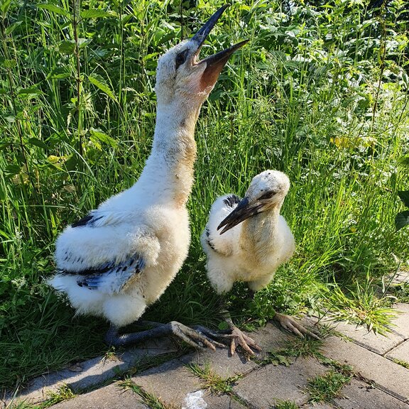 Die Kleinen entwickelten sich sehr gut und machten ihre ersten Stehversuche. Dank guter Fürsorge unserer Mitarbeiter waren sie bis zum August fit für den Abzug in das Winterquartier. Vorher konnten sie gemeinsam mit unseren anderen Jungstörchen die umliegenden Wiesen nach Mäusen und Insekten absuchen. Immer sicher, dass sie bei uns in der Wildtierstation noch eine extra Portion Futter bekommen, solange sie noch nicht voll selbstständig sind.