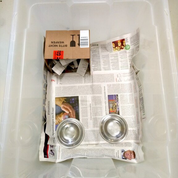 Bei der Unterbringung eines Igels ist es wichtig zu beachten, dass Igel dämmerungs- und nachtaktiv sind. Sie sollten also an einen ruhigen Ort und nicht im Wohnzimmer, Küche oder Schlafzimmer untergebracht werden. Außerdem ist ein natürlicher Tageslichteinfall notwendig, damit der Igel auch weiß, wann die Dämmerung bzw. Nacht beginnt und wann er schlafen sollte. Als kurzzeitige Unterbringung eignet sich eine Pappkiste. Als längere Behausung sind Plastikboxen besser geeignet, da diese nicht durchweichen und gut gereinigt werden können. Geeignete Plastikaufbewahrungsboxen findet man in Baumärkten oder Möbelhäusern. Die Grundfläche der Box sollte ca. 60 x 80 cm betragen und muss unbedingt mind. 45-50 cm hoch sein, damit der Igel nicht rausklettern kann. Als Bodengrund eignet sich saugfähiges Zeitungspapier, in Streifen gerissen oder zusammen geknüllt kann das Zeitungspapier auch als Nestmaterial angeboten werden. Ein kleiner Karton kann umgedreht und mit Eingangsloch als Schlafhaus angeboten werden. Wer lieber auf Naturmaterialen zurückgreifen möchte, kann getrocknetes Laub mit Stroh vermischen und damit das Nest ausstopfen. Keinesfalls sollte nasses Laub oder Heu verwendet werden, da dieses schnell schimmelt.