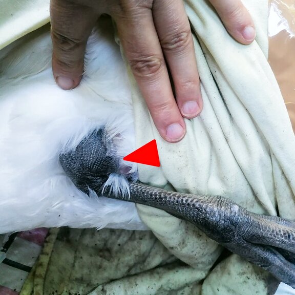 Mit Brot lockten sie das Tier an und sahen dann auch die Ursache: Eine lange Angelschnur hatte sich um das Schwanenbein gewickelt und den Vogel einseitig gefesselt. Alle Befreiungsversuche führten nur dazu, dass sich die Schnur enger zog. Der Vogel muss schlimme Schmerzen gehabt haben. Nach einigen missglückten Fangversuchen rief Maurice bei uns an und bat um Hilfe.