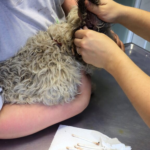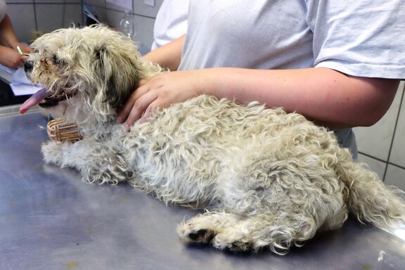 Bei den von uns aufgenommenen Vierbeinern handelt es sich überwiegend um Miniature Bull Terrier, zum Teil auch vermischt mit anderen Rassen. Ein Yorkshire Terrier, ein LabradorMix sowie diverse kleine Mischlingshunde sind auch noch dabei. Die Hunde sind teilweise sehr verängstigt und zittern, sobald man sich ihnen nähert. Viele haben alte Bissverletzungen. Dass es offensichtlich Beißereien unter den friedfertigen Miniature Bull Terrier gegeben hat, ist ein Zeichen, dass die Haltung sehr beengt und stressig gewesen sein muss. Einige Tiere sind außerdem unterernährt, und es gibt sehr ungepflegte Exemplare mit verfilztem, dreckigem Fell. Unsere Tierheim Tierärztin stellte unter anderem bei mehreren Hunden eitrige Augenentzündungen, extrem verdreckte Ohren, zu lange Krallen und katastrophal schlechte Zähne mit Zahnstein und Zahnfleischentzündungen fest.