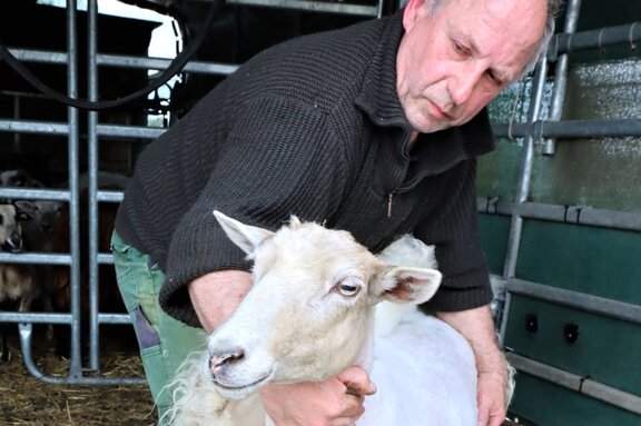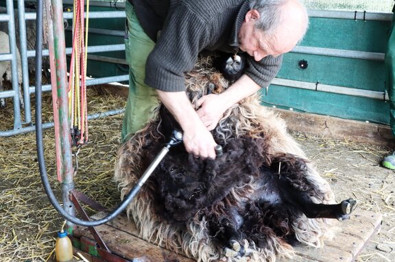 Obwohl nötig, ist die Schur eine stressige Angelegenheit. Schafe sind Herdentiere. Dass sie zum Scheren von ihren Artgenossen getrennt werden, versetzt sie in Unruhe. Außerdem mögen es diese Fluchttiere gar nicht, wenn man sie packt und auf den Hintern setzt. Das ist die übliche Position zu Beginn der Schur. Wenn hier der Umgang nicht ruhig und zugewandt ist, geraten die Tiere leicht in Panik.