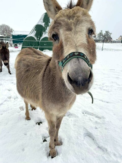 Darwin hatte nach einer Zahn-OP und Arthrose im Kiefer das Fressen eingestellt. Drei Wochen lang wurde in der Klinik um sein Leben gekämpft, und es wurde alles versucht, doch er hat uns die Entscheidung abgenommen und ist von selbst gegangen. Begleit-Eselin Jule war die ganze Zeit bei ihm. Mitarbeiterin Resi, unsere „Esel-Mutti“, hat sich die letzten vier Jahre intensiv um unseren Esel-Opi gekümmert und ihm unter anderem jeden Tag seinen Tee gekocht, der immer so toll von euch gespendet wurde. Er wurde jeden Tag bekuschelt und hat auch zeitweise Massagen und eine Lasertherapie von unserer Heilpraktikerin Claudia Bahr bekommen. Wir sind unendlich traurig und werden unseren Darwin schmerzlich vermissen!