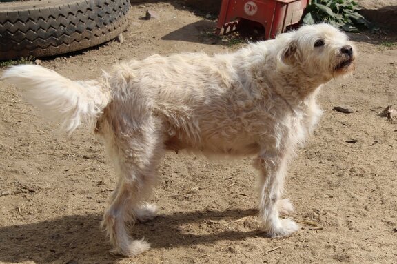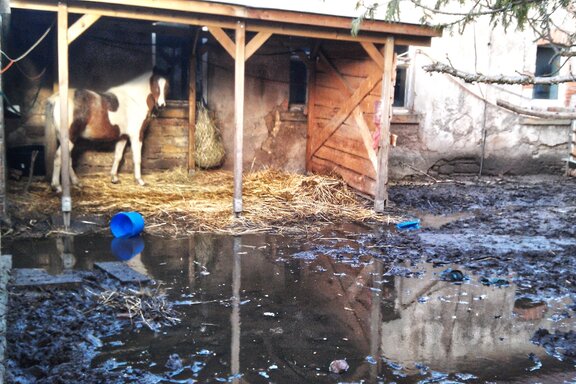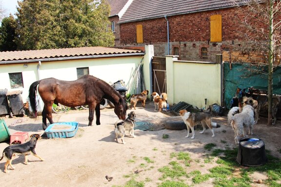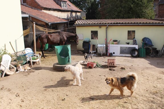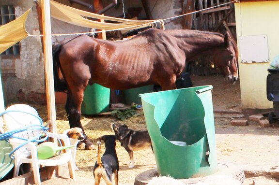 Zwischen den zahlreichen Haufen liegen auch noch Pferdeäpfel, denn ein brauner Wallach muss sich diesen „Lebensraum“ mit den Hunden teilen. Er steht apathisch in einer Ecke auf ein paar Strohhalmen unter einem löchrigen Stofffetzen, der wohl als Witterungsschutz gedacht, aber gänzlich unzureichend ist. Das Pferd wird fast ständig von den gelangweilten Hunden angebellt und angegriffen, hat keine Möglichkeit auszuweichen und kommt nie zur Ruhe.