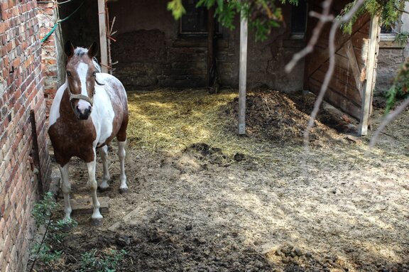Durch eine Mauer vom Hundehof getrennt gibt es einen weiteren kleinen Auslauf, in dem ein zweites Pferd in Einzelhaft lebt. Etwa 2/3 der Fläche ist mit Kot bedeckt, und auch in dem an die Hauswand gebauten Unterstand häufen sich die Pferdeäpfel. Die Haltung der beiden Rosse verstößt gravierend gegen das Tierschutzgesetz sowie gegen die Leitlinien zur Pferdehaltung des Bundesministeriums für Ernährung und Landwirtschaft (BMEL). So wird ihr Bedürfnis nach Bewegung und Sozialkontakt nicht ansatzweise befriedigt. Sie stehen ohne Artgenossen und werden nach Zeugenaussagen nur im Sommer etwa zweimal im Monat für eine Stunde draußen spazieren geführt. Das kann dem Bewegungstier Pferd niemals genügen, und es ist davon auszugehen, dass bereits körperliche Beeinträchtigungen wie Schäden am Bewegungsapparat, Atemwegsprobleme oder Stoffwechselstörungen vorhanden sind.