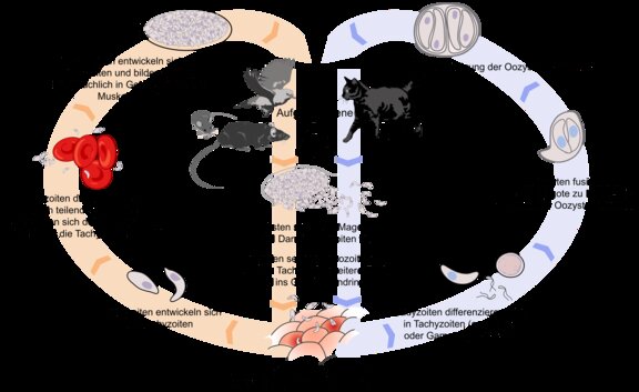 Der Entwicklungszyklus des Parasiten ist spannend. Er siedelt primär im Darm von Katzen und scheidet dort sogenannte Oozysten, also eine Art Eier aus. Damit ist die Katze sein sogenannter Endwirt. Die eierähnlichen Gebilde gelangen in die Umwelt und sind sehr widerstandfähig gegenüber Umwelteinflüssen. Sie können im Freien viele Monate überleben. Werden diese Oozysten von Mäusen oder anderen Wirbeltieren bei der Nahrungsaufnahme zufällig mit aufgenommen, wandern sie aus dem Darm des neuen Wirtes in dessen Muskelgewebe oder seine Organe ein. Dort warten diese Entwicklungsstadien gemütlich ab. Im nächsten Schritt hofft der Parasit nun darauf, dass sein eigener Gastgeber verspeist wird. Wird nun also beispielsweise eine bereits infizierte Maus von einer Katze gefressen, und diese Maus im Katzendarm verdaut, wird der Parasit frei und kann sich erneut im Darm des Stubentigers ausbreiten. Jetzt beginnt der Zyklus von neuem.